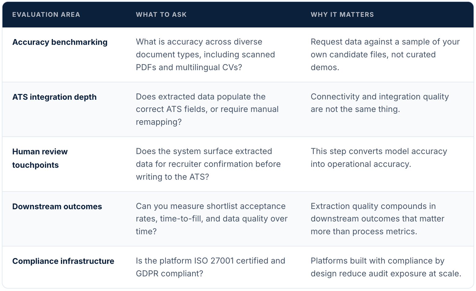 In most vendor evaluations, the extraction layer receives far less scrutiny than it deserves. Attention concentrates on matching algorithms and dashboards because those are more visible in demos. Extraction accuracy is harder to surface because demo documents are always well-formatted. Yet for any agency seriously evaluating AI in recruitment, extraction accuracy sets the ceiling for everything else in the stack. The criteria below are more useful in practice than feature comparisons.