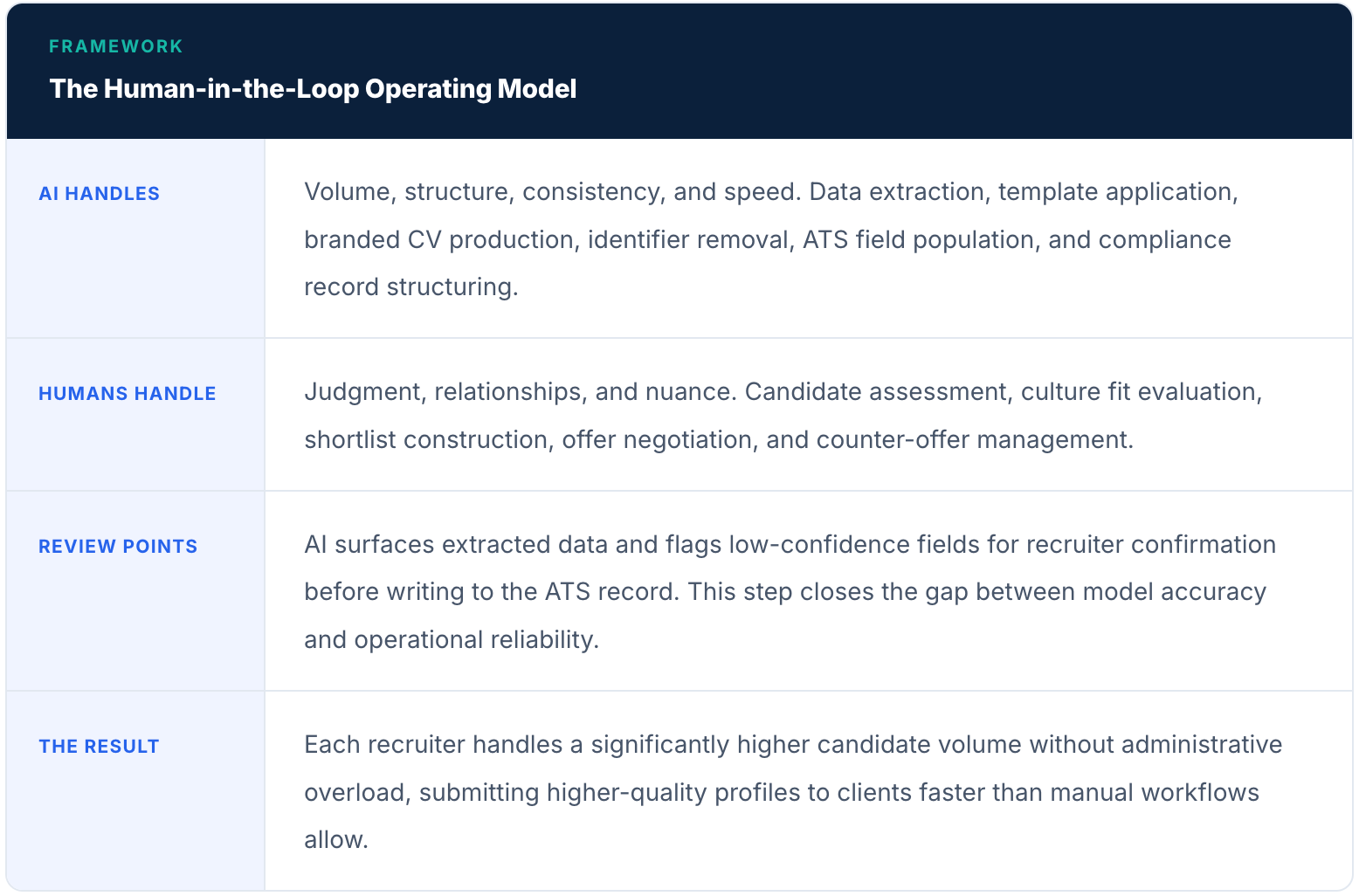 In practice, the framework assigns AI to volume, structure, consistency, and speed: data extraction from diverse CV formats, template application, branded candidate presentation, identifier removal, ATS field population, and compliance record structuring. Humans retain control over judgment and relationships: candidate assessment, culture fit evaluation, shortlist construction, offer negotiation, and counter-offer management. The framework below illustrates how this division operates, including the review points that convert AI output into trusted data.