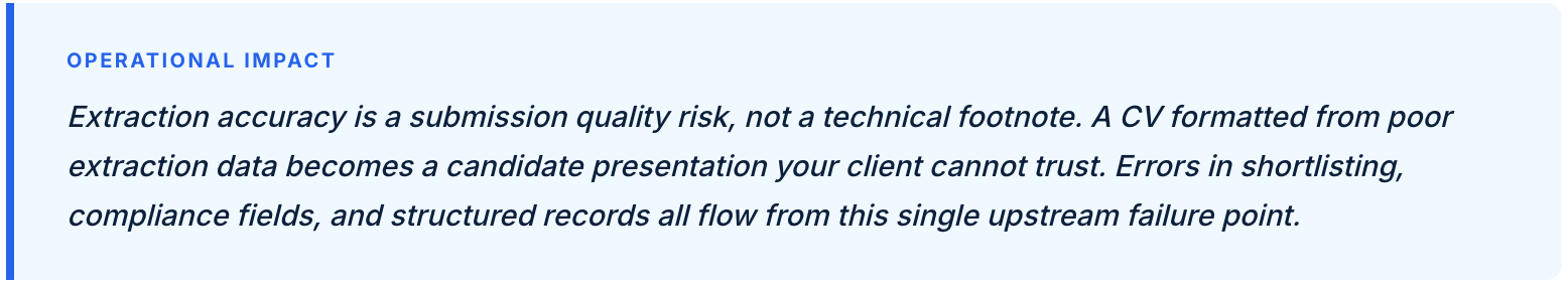When unstructured data enters an ATS without being properly extracted first, every subsequent step in the recruitment workflow degrades. Search and match functions operate on structured fields. When those fields are populated with errors or left blank because the parser could not resolve the document, shortlisting becomes noisier, match quality falls, and compliance records carry forward inaccuracies that are difficult to audit and expensive to correct. Most agencies treat this as a minor inconvenience. In practice, it is a systemic performance drag that affects time-to-fill, submission quality, and client confidence simultaneously.
