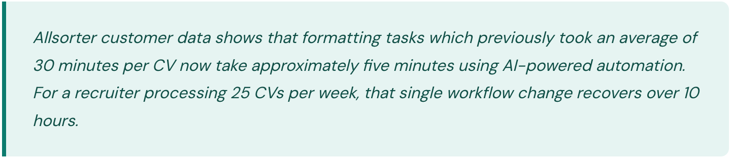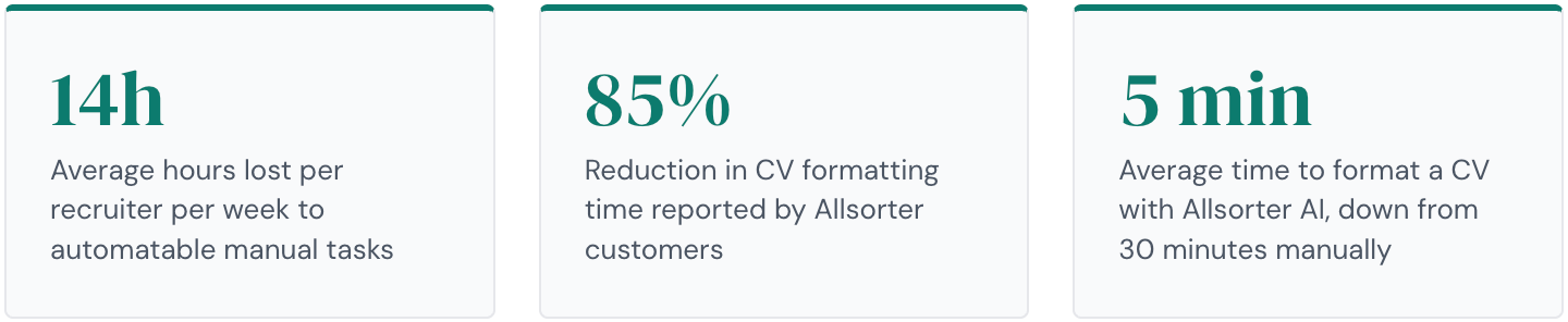 Most agencies track billings, placements, and time-to-fill. Far fewer track how their recruiters actually spend their hours. Research cited across the HR technology sector suggests that recruitment professionals lose an average of approximately 14 hours per week to automatable tasks, more than a third of the working week consumed by activity that generates no direct placement value. CV reformatting alone accounts for a significant share of that loss: according to Allsorter's research across hundreds of agencies, manual CV formatting averages 30 minutes per profile. For a team of ten recruiters each handling 20 or more submissions per week, that single task is the equivalent of a full-time employee consumed entirely by administrative overhead.