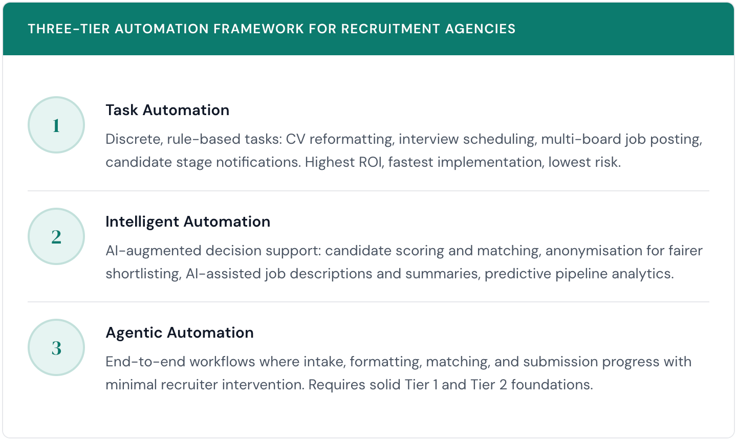 Tier One targets discrete, rule-based tasks where automation delivers the clearest and fastest return. This is where recruiter productivity tools generate the most immediate impact: CV reformatting sits squarely here, as do interview scheduling, multi-board job posting, and automated stage notifications. These tasks require no AI judgment, only well-configured software, and they consistently deliver the highest return on investment across agency sizes and recruitment specialisms. Agencies that resolve their Tier One tasks systematically report recovering 10 to 15 hours per recruiter per week, time that returns directly to revenue-generating activity.