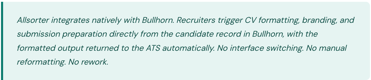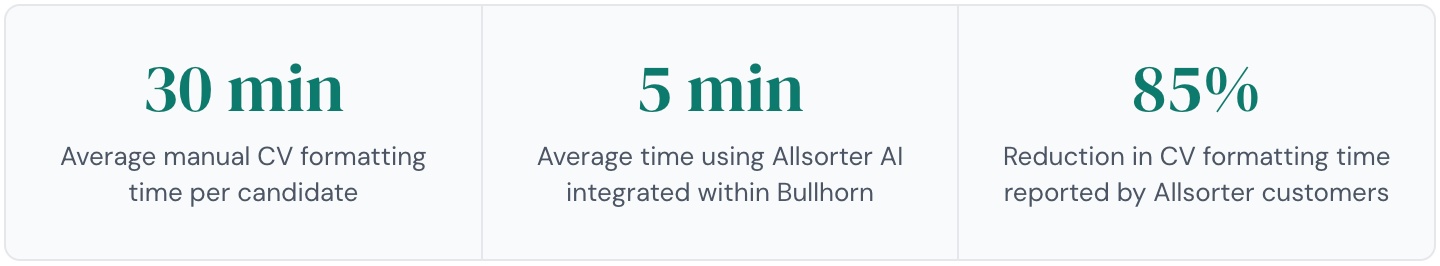 This is the single largest time sink in the Bullhorn workflow for most agencies and the point where automating Bullhorn delivers the most immediate commercial return. Every CV submitted to a client needs to conform to the agency's branded template, have personal contact details removed to protect against candidate poaching, and present experience in a consistent, professional format. Done manually, this averages 30 minutes per candidate. Done through an AI-powered reformatting tool integrated into Bullhorn, the same output takes approximately five minutes. Allsorter integrates natively with Bullhorn to automate this step: extracting candidate data from the ATS record, applying the agency's branded Word template, removing identifying information, and returning a client-ready CV without the recruiter leaving the interface.