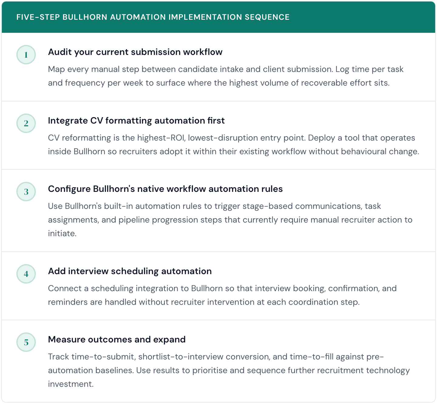 The operational challenge for most agencies is not identifying which Bullhorn automation workflows to target. The harder problem is sequencing the implementation without disrupting live recruitment activity across active desks. The framework below provides a logical, low-disruption order for building faster, more automated submission workflows within the Bullhorn ecosystem, with each step designed to deliver measurable return before the next begins.